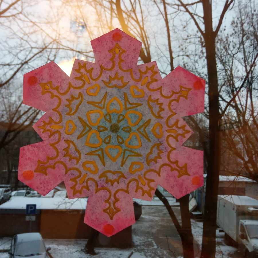 Как долго декор продержится на окне? Несколько месяцев точно может! Только нужно учитывать, что весной и летом, на ярком свету фломастеры будут выгорать. Свободные края бумаги, даже промасленной через несколько недель станут скручиваться, но их можно подклеивать по мере необходимости.