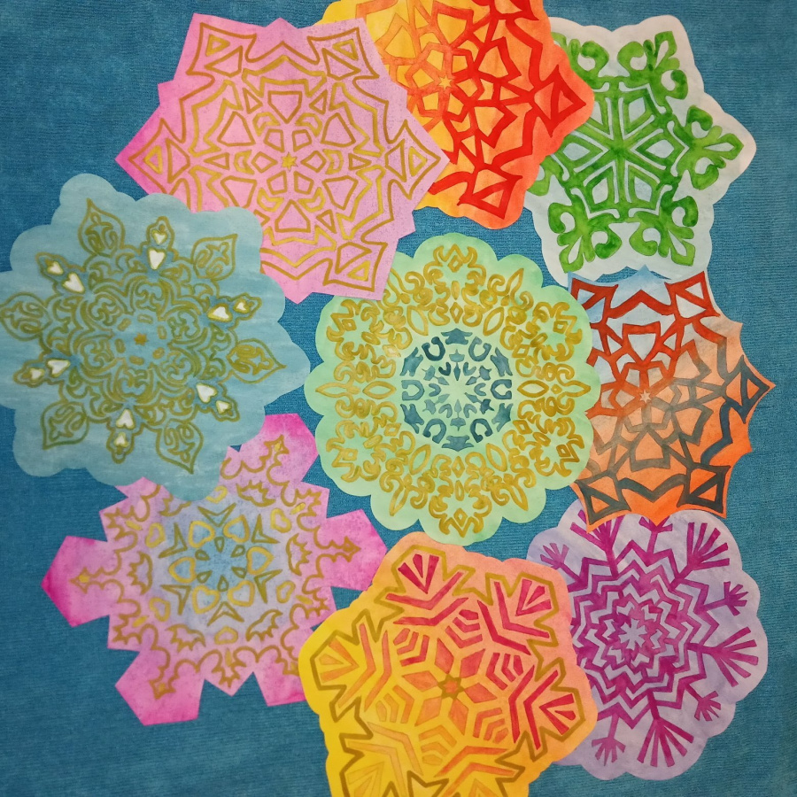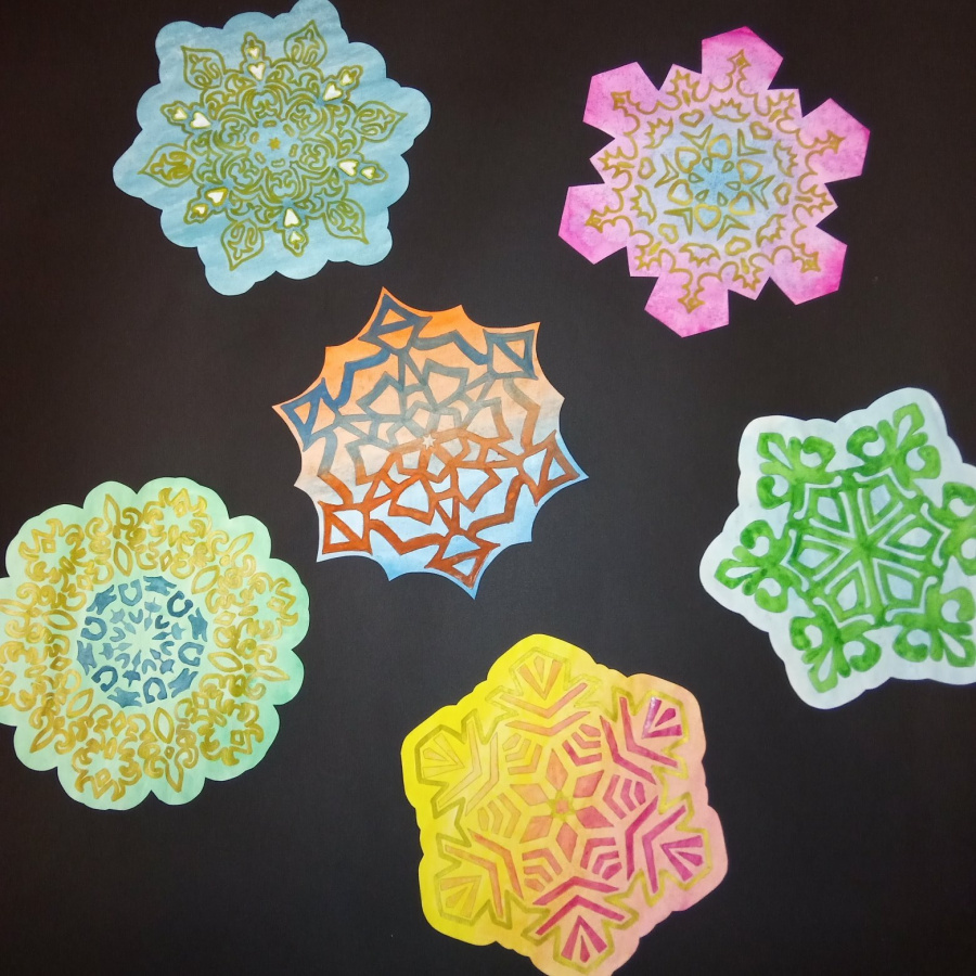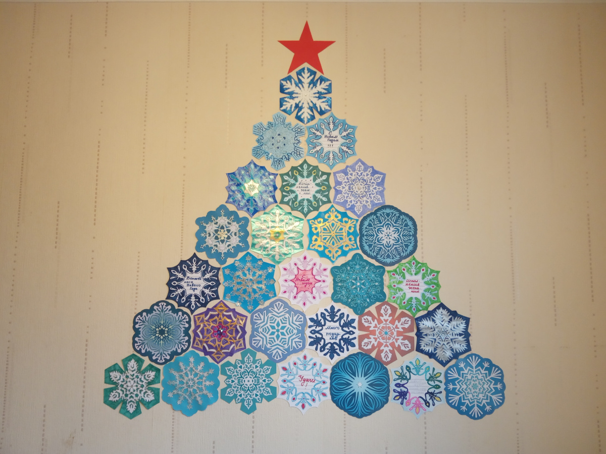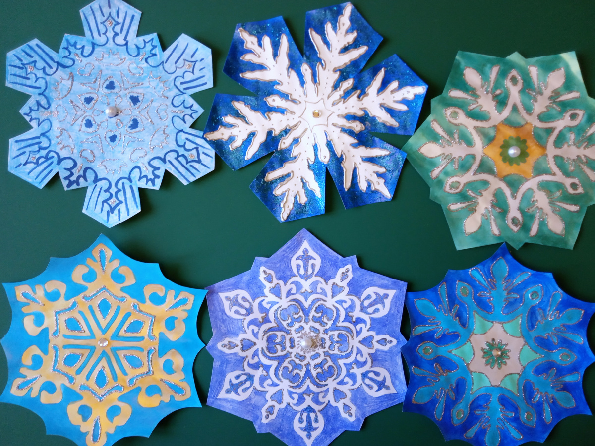 Эти снежинки универсальны: они подходят для декора окон в стиле пропускающих свет витражей; ими можно украшать двери, пробковые доски; из них можно собирать сердца, снежные вихри и елки на стенах (в классе, коридоре, рекреации); собирать гирлянды и крепить к потолку на спиральных бумажных лентах, имитируя снегопад - все, что угодно в одном комплекте!