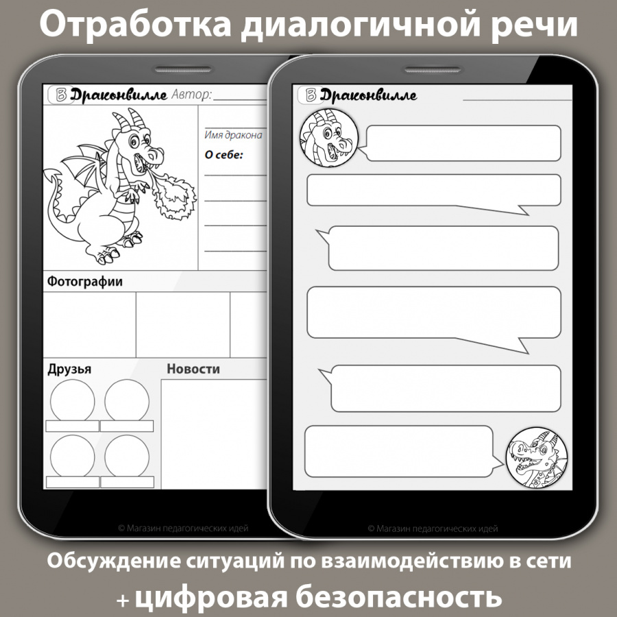 12 страниц соцсети ВДраконвилле с персонажами-драконами + диалоги в мессенджере помогут не только пофантазировать, но и отработать поведение в соцсетях. Простые вещи могут быть эффективными. А заполненные и раскрашенные шаблоны можно повесить в классе, создав целую галерею.