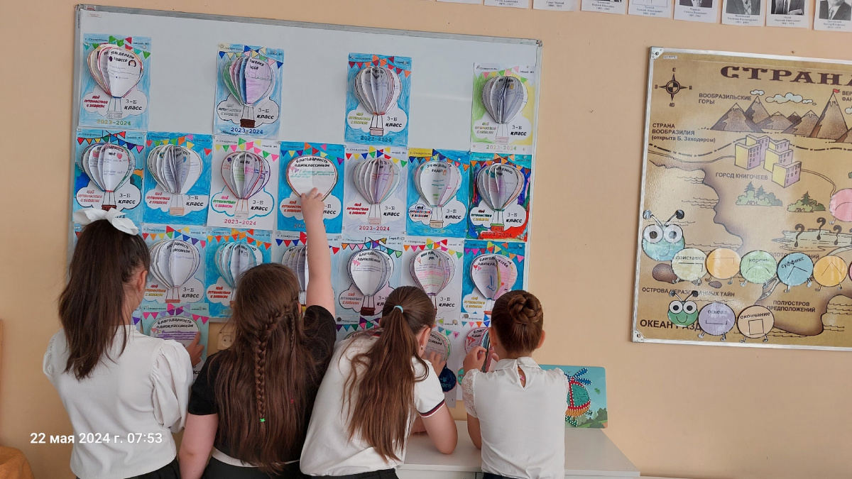 В конце учебного года - Декор двери "Летим в следующий класс", альбом для рефлексии в виде воздушного шара и дисплей с сердцами.