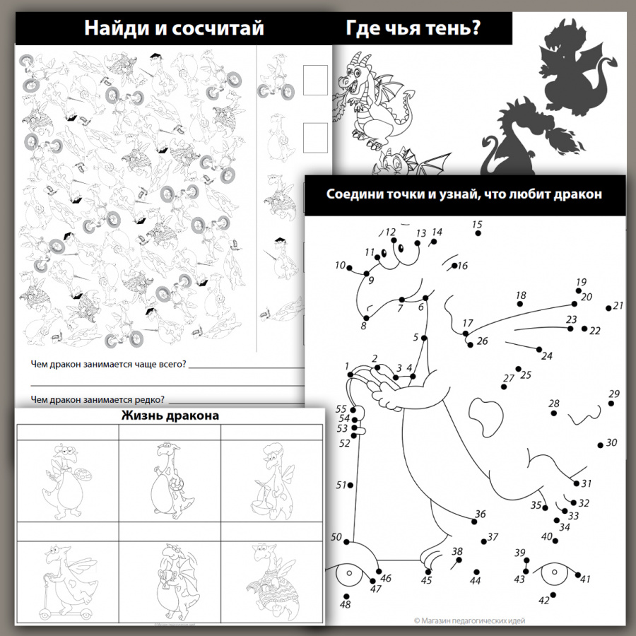 Задания в этом комплекте связаны с драконами. Задания не связаны друг с другом и могут быть использованы в любой последовательности, за исключением самого первого задания, в ходе которого ребята узнают, что от них требуется (шифровка).