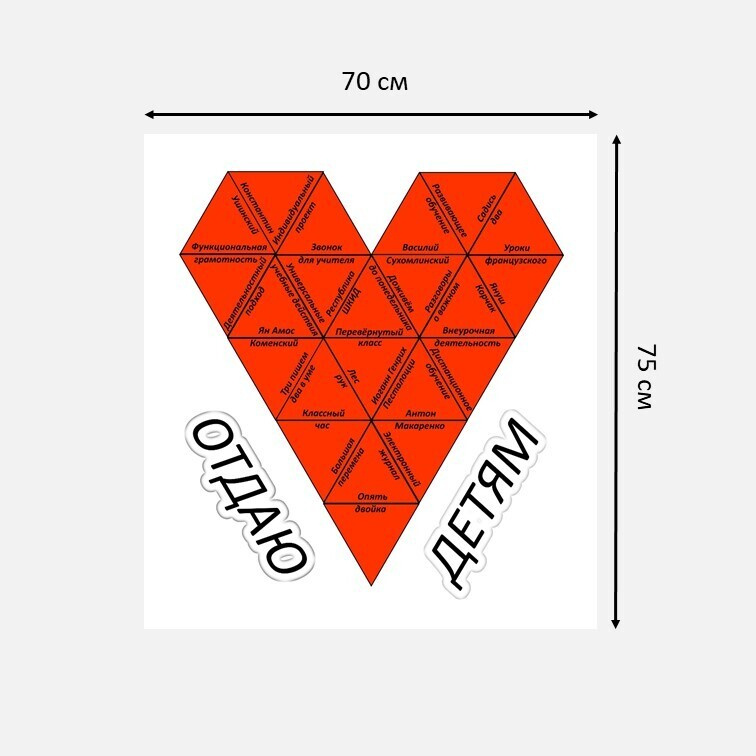 Материал посвящен профессии учителя и приурочен к профессиональному празднику. В основе декора лежит название книги Василия Александровича Сухомлинского «Сердце отдаю детям». Сердце оформлено в виде игры – тримино.