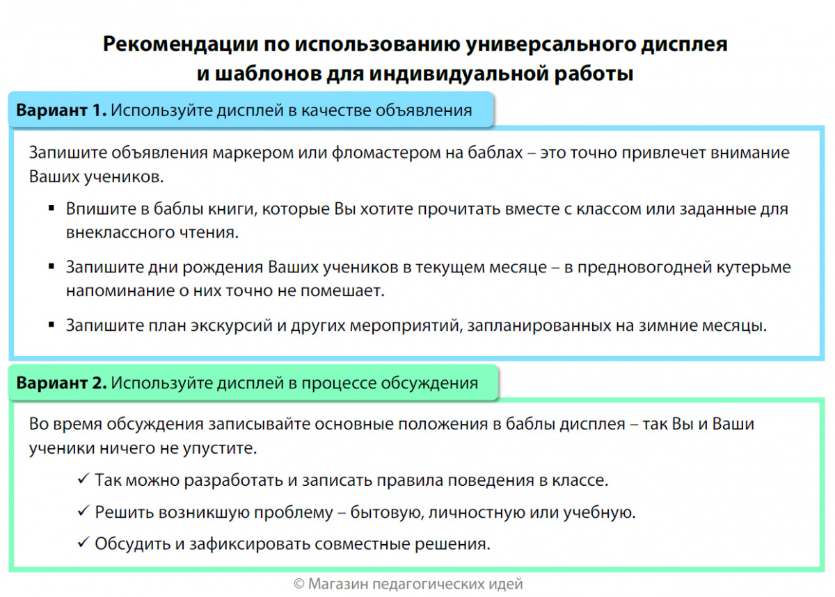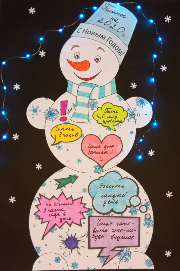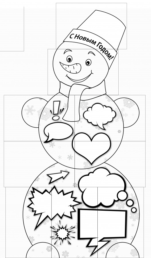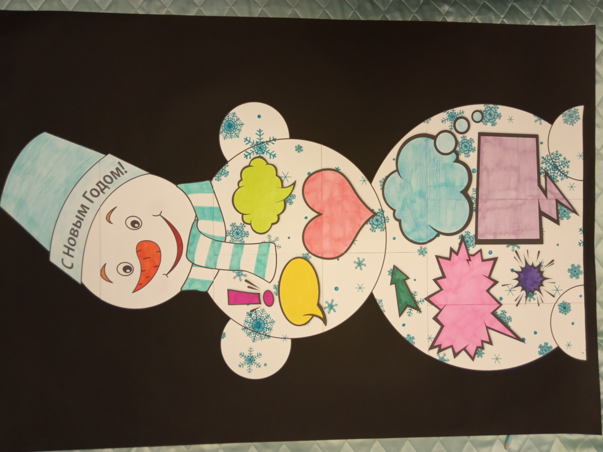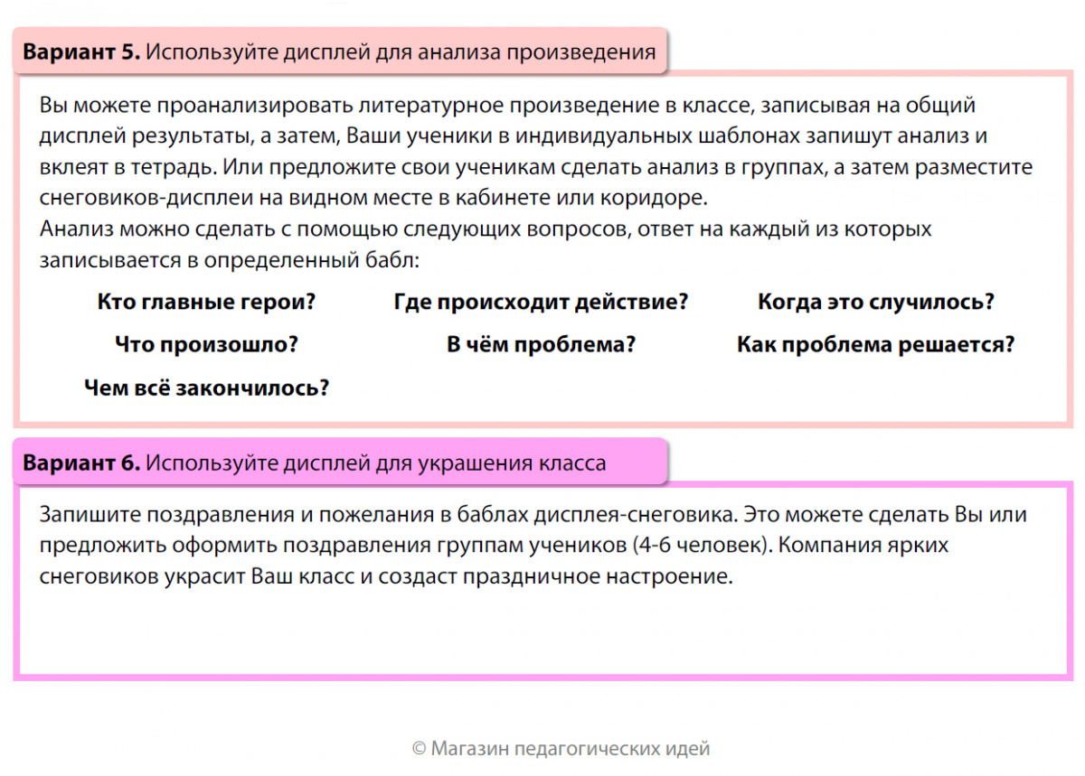 Большой дисплей-снеговик как раз такое решение. Он большой - метр в высоту. На нем есть специальные места - баблы, как в комиксах- для надписей. Его можно собирать, раскрашивать и заполнять всем классом, в группах или парах. Есть баблы на отдельных листах, чтобы если что-то пошло не так, можно было их распечатать, вырезать и наклеить на испорченное место дисплея.