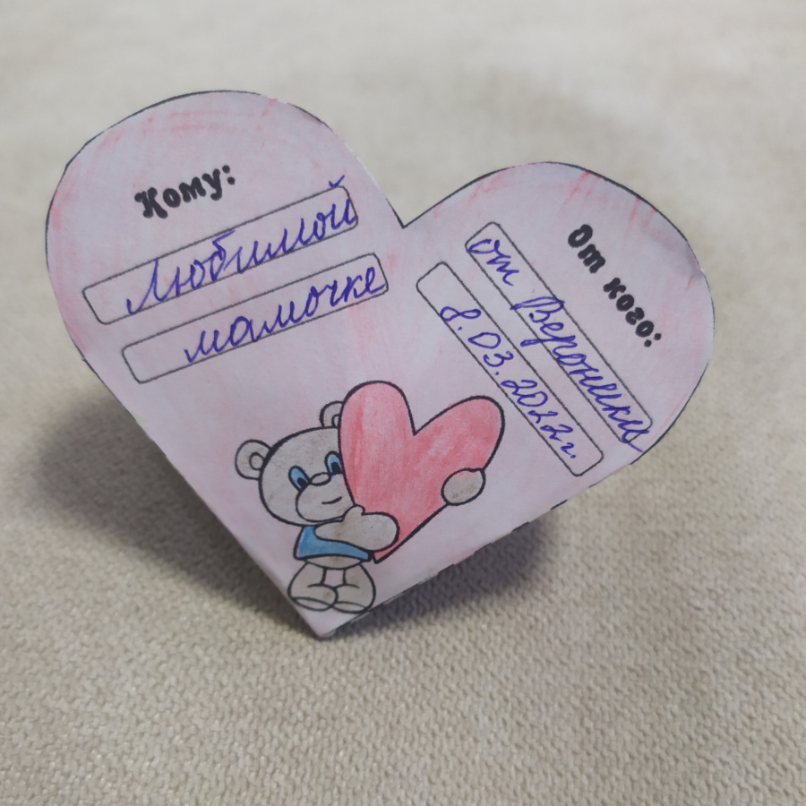 Эта валентинка – отличный вариант поделки на уроке технологии. Она отлично подойдёт для подарка другу в День влюблённых, а так же в другие праздничные дни. Например, маме к 8 марта. Это возможно потому, что на обложке валентинки нет упоминания о Дне Святого Валентина, благодаря чему она становится универсальной.