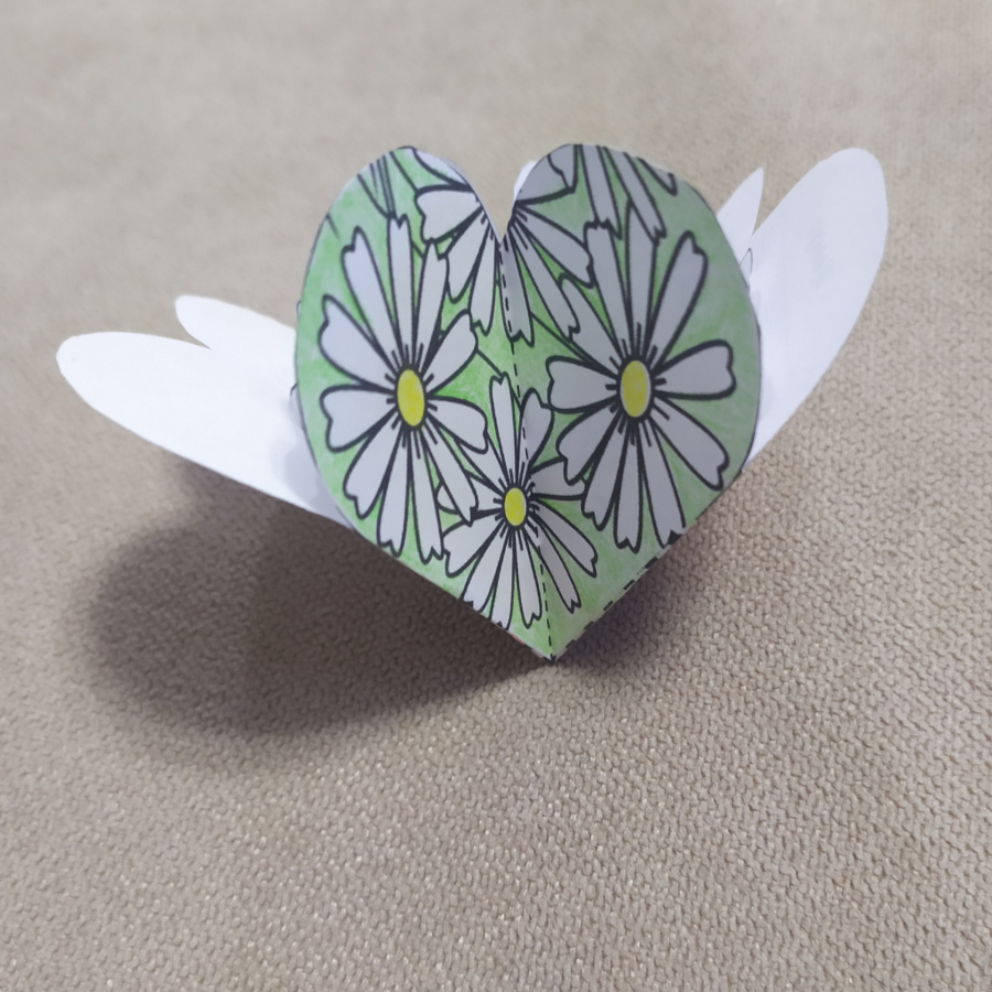 В комплект входит шаблон валентинки и детали ромашки в двух вариантах: цветном и чёрно-белом. Схема сборки довольно проста, что позволяет справиться с работой даже первокласснику.