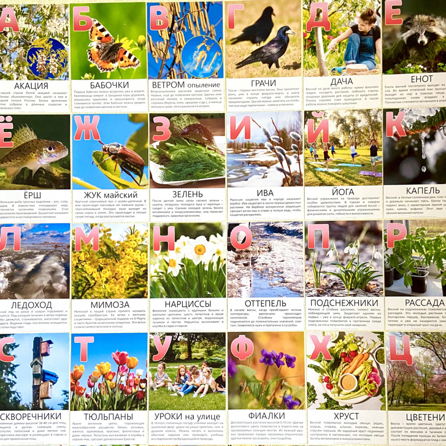 Создайте сезонный уголок или впечатляющую фотостену в классе с карточками "Весенний алфавит". Карточки с осенними объектами на каждую букву русского алфавита, кроме Ъ, Ы, Ь, для букв К, Л, М, Н, О, С, Т, Я по несколько вариантов карточек. Фото в высоком разрешении, чтобы можно было рассмотреть детали, яркая цветовая гамма. Распечатать можно 1 карточку на А4 или 2 на А4.