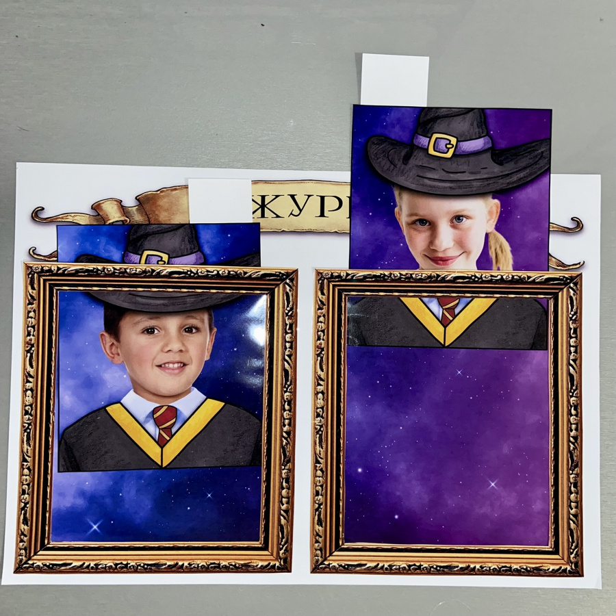 - Дополнительные элементы оформления (метла, шляпа, волшебная палочка, указатели-руки, звезды)