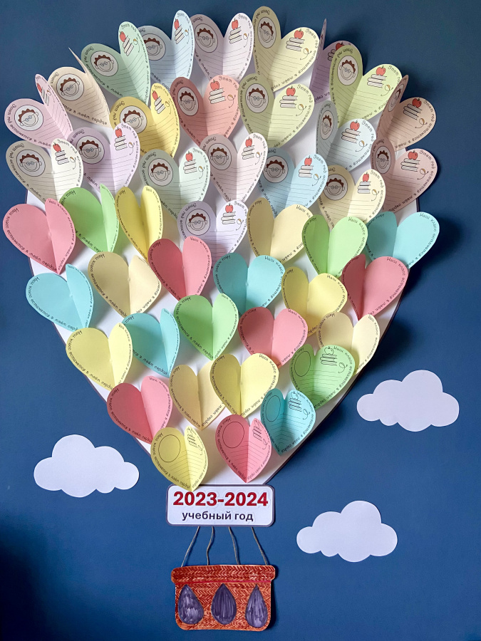 Вариант 1. Ученики записывают на сердцах впечатления об учебном годе и наклеивают на шар. Если учеников в классе много (30+), то сердца нужно сложить пополам и наклеить в полураскрытом состоянии, как крылья бабочки – так сердец войдет больше.